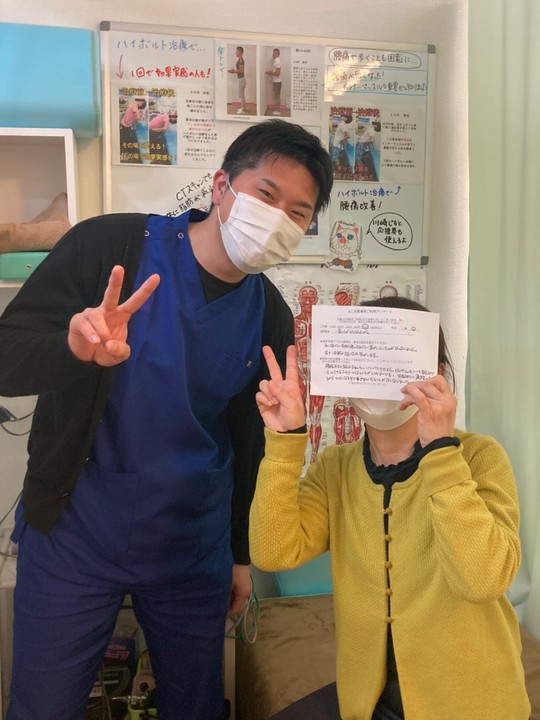 ハイボルトで痛みがなくなり、予防のため楽トレをすすめられました。今は朝起きた時の腰の痛みがすっかりなくなり、体調がよくなりました。