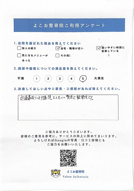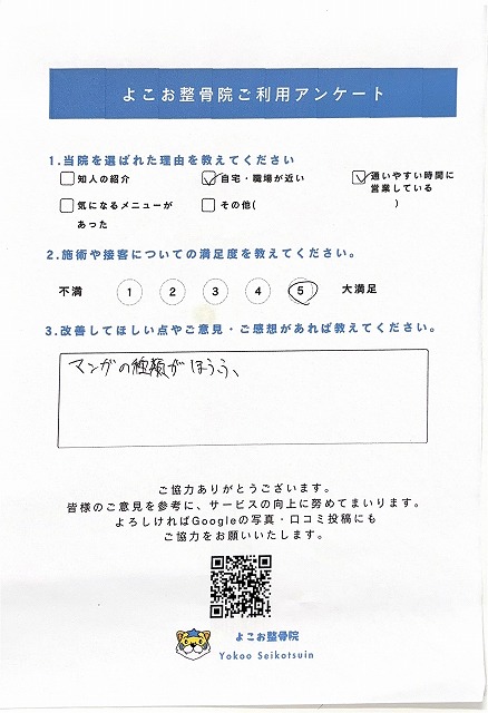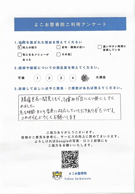 腰痛を長い間見てもらって、痛みが出にくい体にしてくれました。 急な時間・日にち変更に対応していただきありがたいです。 これからもよろしくお願いします。
