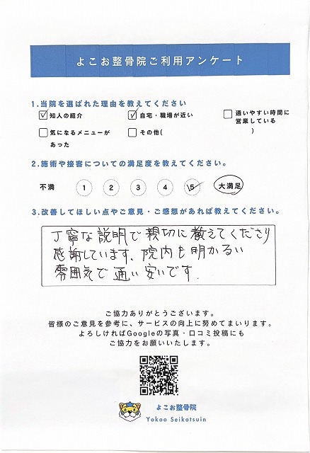 丁寧な説明で親切に教えてくださり、感謝しています。 院内も明るい雰囲気で通いやすいです。