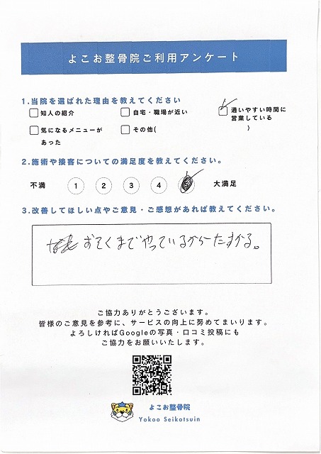 Nさん、ご協力ありがとうございます。 初めて来店されたのが6年前でしたね、元気な状態で今も過ごしていただけて何よりです。今はお孫さんのお世話も大変だと思います。これからも元気でいられるようにお手伝いさせてください。