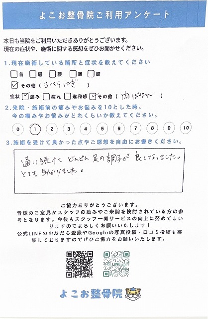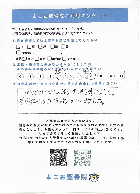 よこお先生は非常に気さくで、明るくて、色んな知識を持って居る方なので信頼出来ます。腰だけじゃなくても、なんでも相談出来るのでこれからも体の事を相談したいと思います。