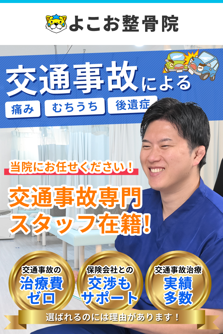 交通事故にあい、なかなか症状が取れずお悩みの方はぜひ『よこお整骨院』の受診をおすすめします。迷わず、よこお整骨院に足を運んでみてください。